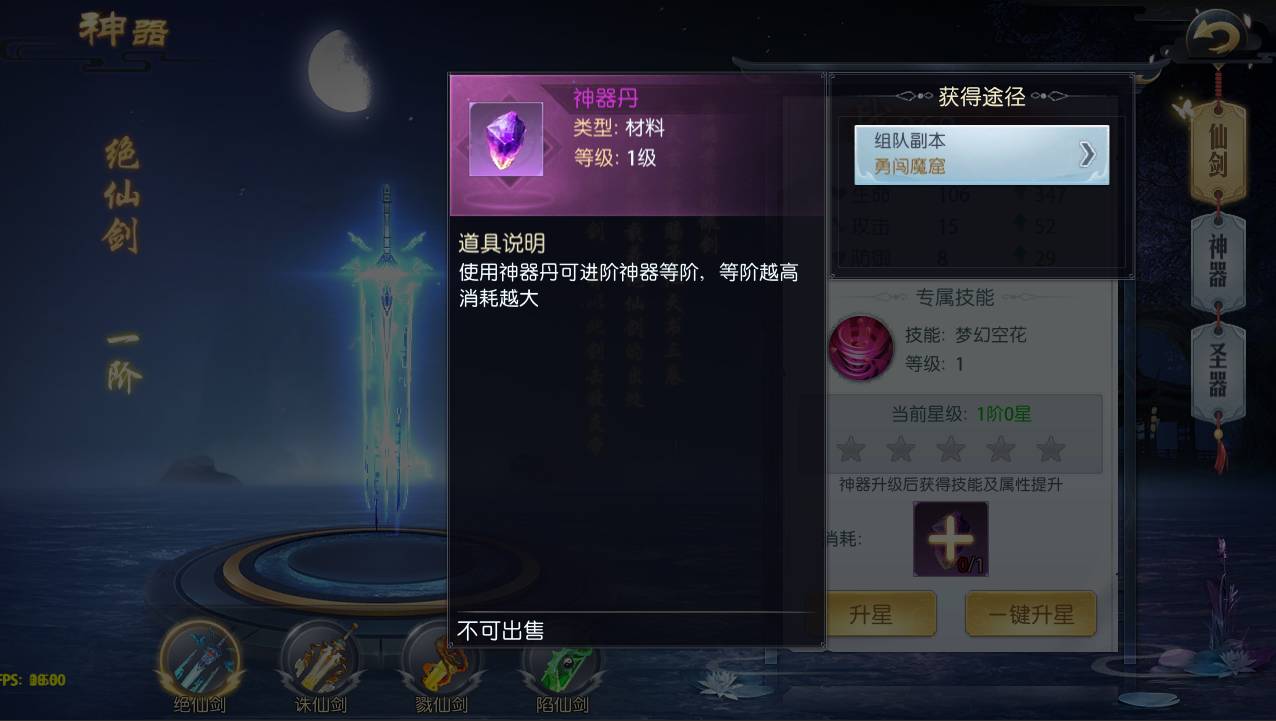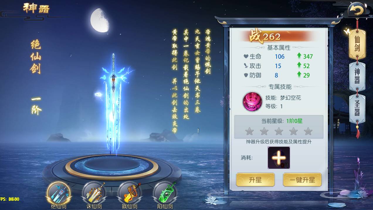 仙剑一共4种,分别是绝仙剑、诛仙剑、戮仙剑、陷仙剑,每一种仙剑对应一个主动技能,升级仙剑可以提升属性和技能,下面再简单介绍仙剑系统的进阶升星